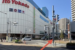 イトーヨーカドーの手前の横断歩道を渡りそのままお進みください。